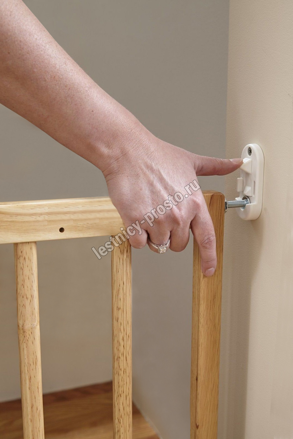 Изделие имеет раздвижную конструкцию с большим диапазоном - от 63.5 до 105 см и может быть установлено в любые дверные или лестничные проемы, в качестве основного материала используется натуральное дерево (бук) с высококачественной шлифовкой.