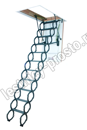 Металлическая чердачная лестница LST оснащена энергосберегающей термоизоляционной крышкой люка белого цвета. По периметру люка установлен контур уплотнения, обеспечивающий высокую степень герметичности. Благодаря «ножничной» системе складывания в сложенном виде лестница очень компактна и имеет небольшой размер крышки люка. S-образные боковые элементы лестницы выполняют роль поручней и придают лестнице современный вид.