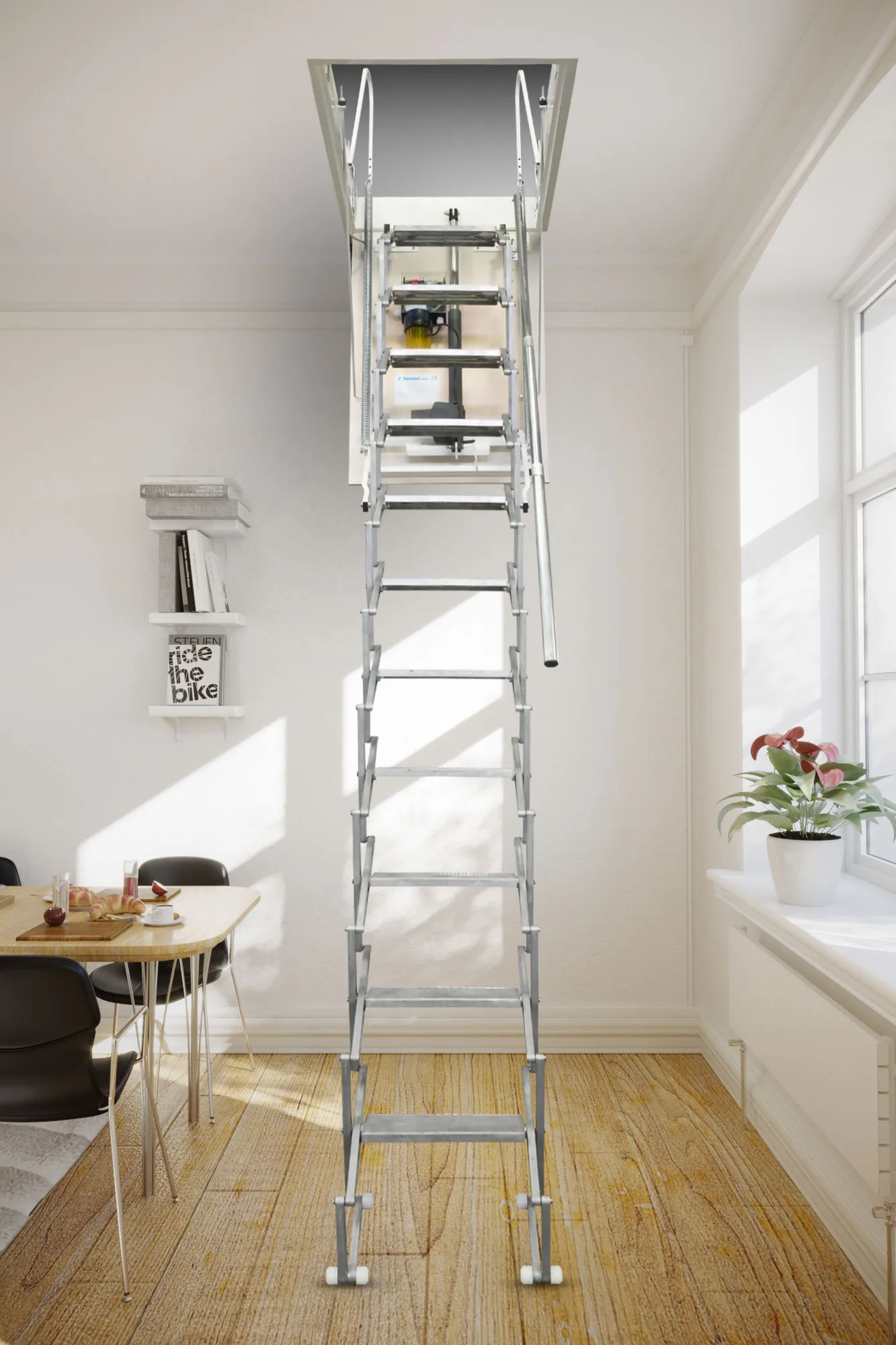 Модель лестницы, благодаря использованию цельнометаллической ножничной конструкции, идеально подходит для установки в помещениях высотой до 290 см. Выбор лестницы NOZYCOWE TERMO SUPER - это инвестиция, которая позволяет минимизировать потери теплого воздуха и значительно снизить расходы на отопление.