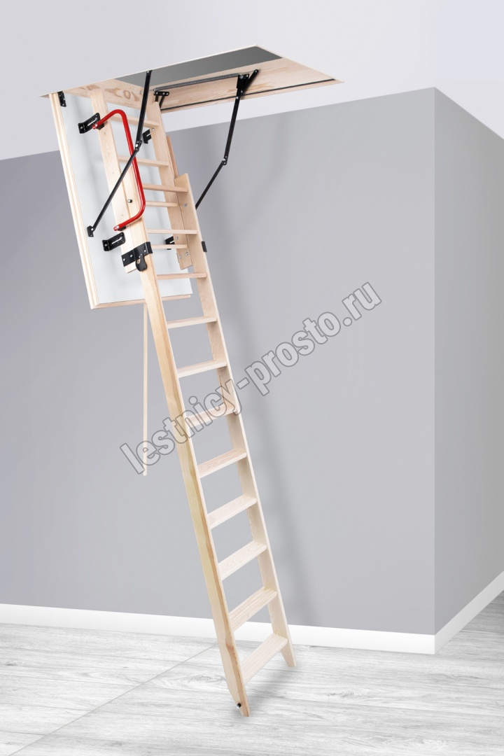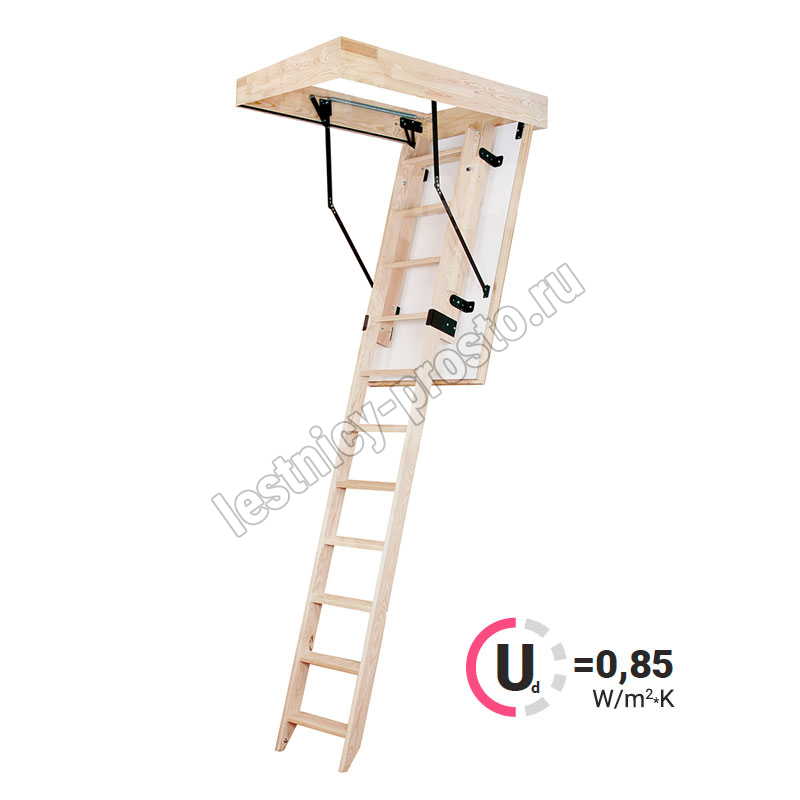 Лестница раздвижная двухсекционная, изготовлена из сосны. Термоизоляционная крышка типа "сэндвич" имеет усиленную теплозащиту, облицована с двух сторон ДСП белого цвета. По контуру короба имеется уплотнитель. Все металлические элементы лестницы покрыты порошковой краской, ступени лестницы имеют антискользящие насечки и закреплены в столярное соединение «ласточкин хвост», что позволяет выдерживать нагрузку 150 кг. При раскладывании лестницы нет вылета за пределы короба, что позволяет использовать эту модель лестницы в таких помещениях, где невозможно использовать чердачные лестницы с большим разбегом открытия. Удобна для эксплуатации на большой высоте. Деревянный стержень для открывания лестницы в комплекте..
