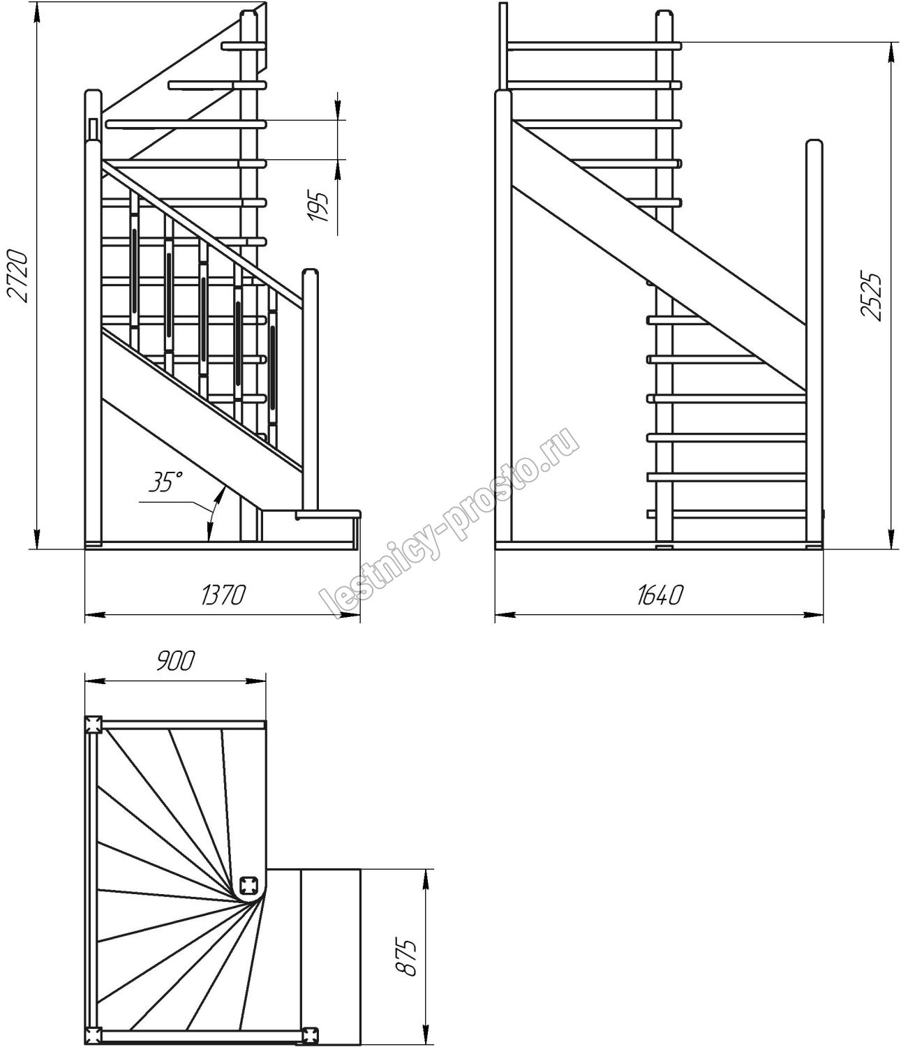 Деревянная межэтажная лестница ЛЕС-03 2525-2720 проем 1640-900, Сосна