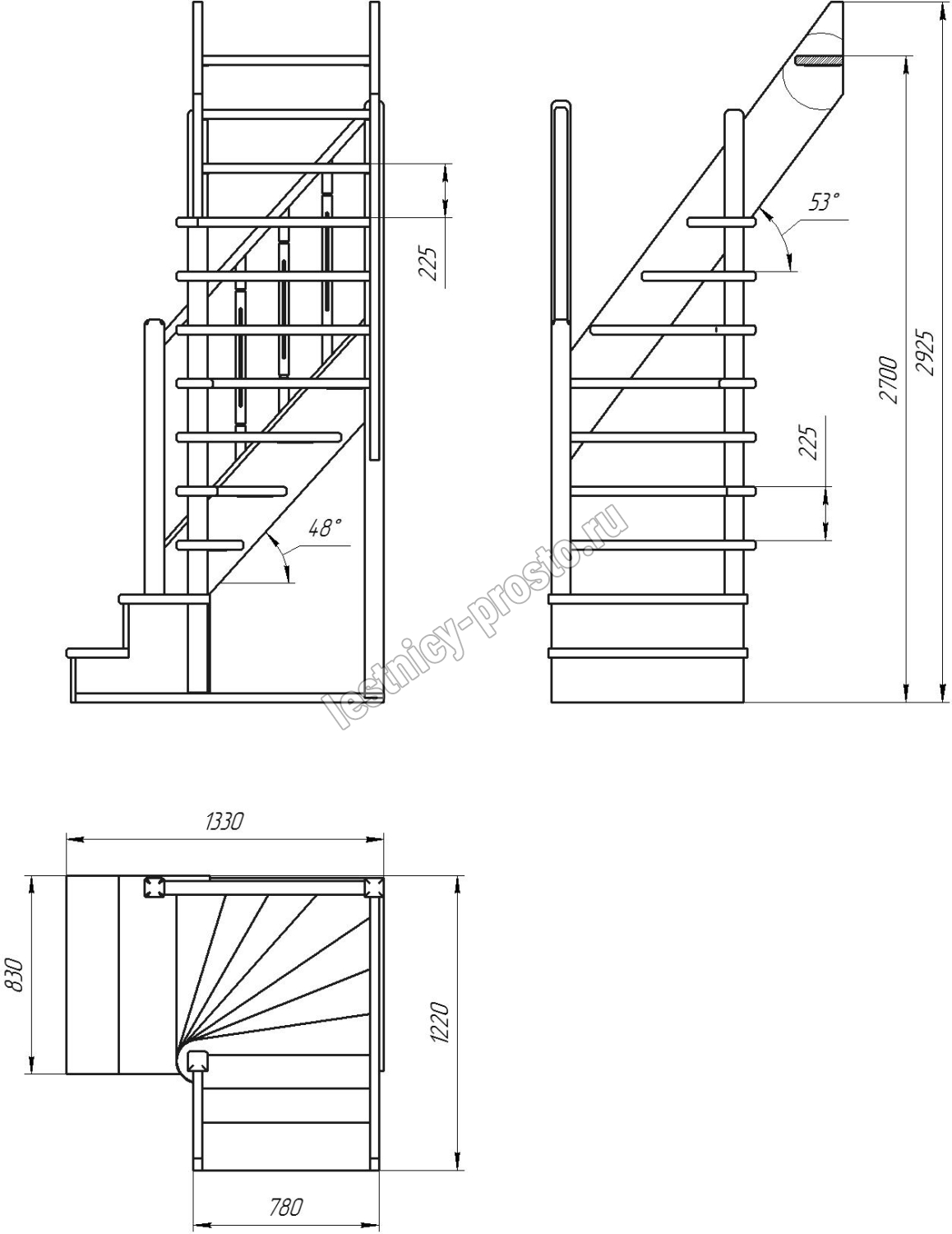 Деревянная межэтажная лестница ЛЕС-91 2700-2925 проем 1220-780, Бук