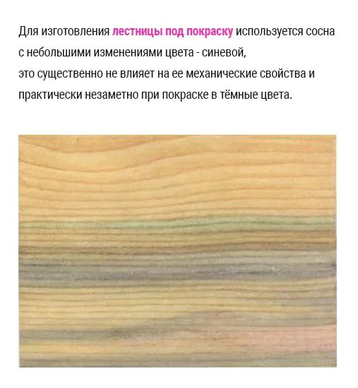 В производстве лестницы ЛС-91м базовая под покраску используется сосна с небольшими изменениями цвета, что практически не влияет на ее механические свойства и почти незаметно при покраске в темные цвета, но позволяет без ущерба для эксплуатационных свойств лестницы получить более доступный по цене вариант лестницы.
