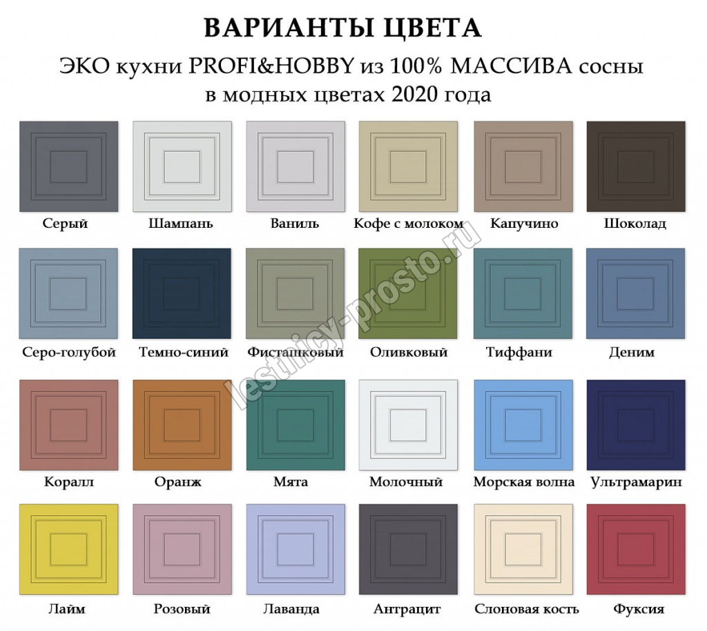 Угловой кухонный гарнитур из 100% массива сосны размером 2 на 1,4 и высотой 2,32 м (в данном проекте использованы высокие верхние ящики 90 см). Цвет на выбор - 27 вариантов (при заказе кухни в нашем интернет магазине просьба указывать название цвета в комментариях).