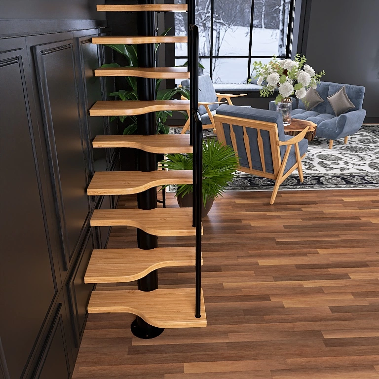 соответствует картинке, но вы не ограничены в его выборе. Лестницу можно приобрести и без ограждения, и с любым другим. Устанавливать на такую лестницу можно почти всё, начиная от классических деревянных балясин и заканчивая эксклюзивными коваными изделиями.