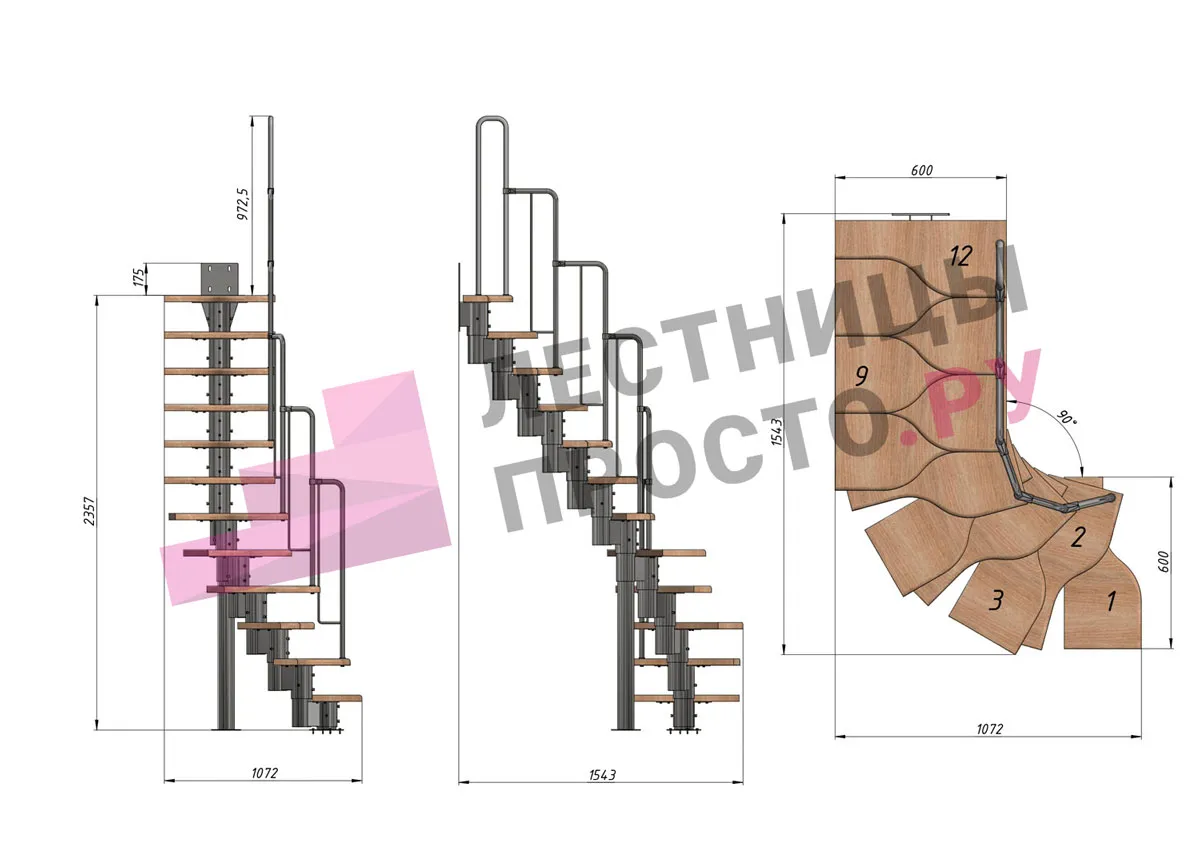 | Лестница Prosto Urban White гусиный шаг 600 мм, h216-312 см (12 ступеней), дуб |