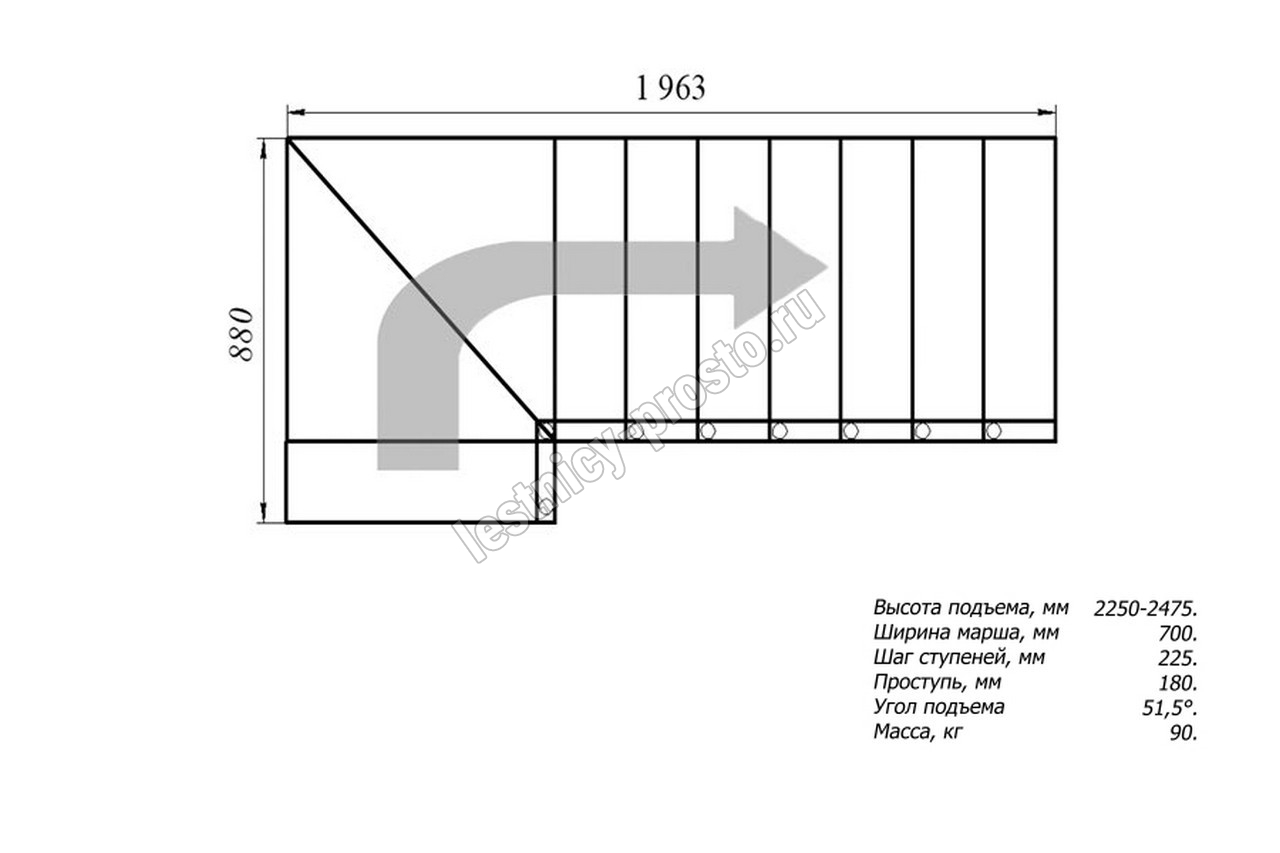 Количество ступеней на первом и втором марше может меняться между собой в зависимости от размера проема, при этом общее количество ступеней не меняется!!!