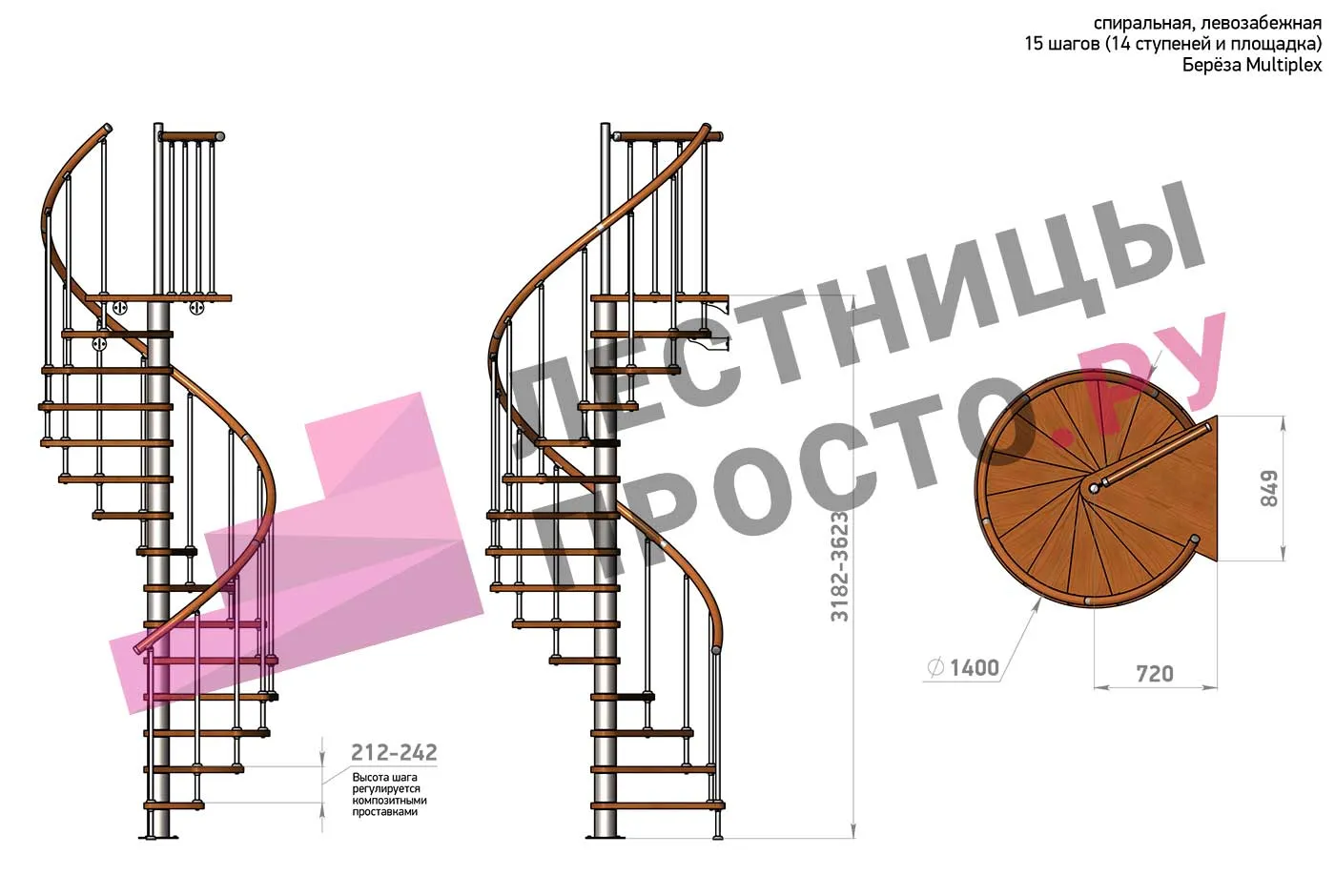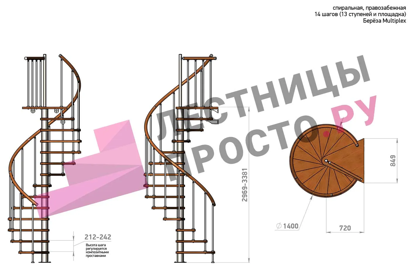 Высота ступеней регулируется с шагом 3 мм. в пределах 212-242 мм., благодаря чему, лестница прекрасно подгоняется под необходимую высоту.