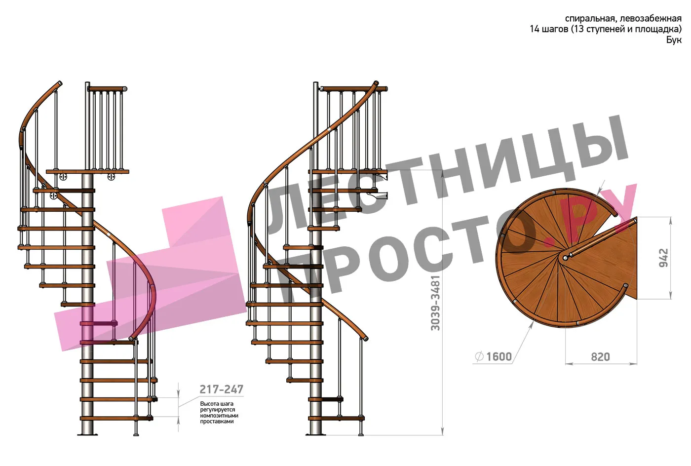 | Винтовая лестница Prosto Spiral Black D140см, h303.9-348,1 см, бук |