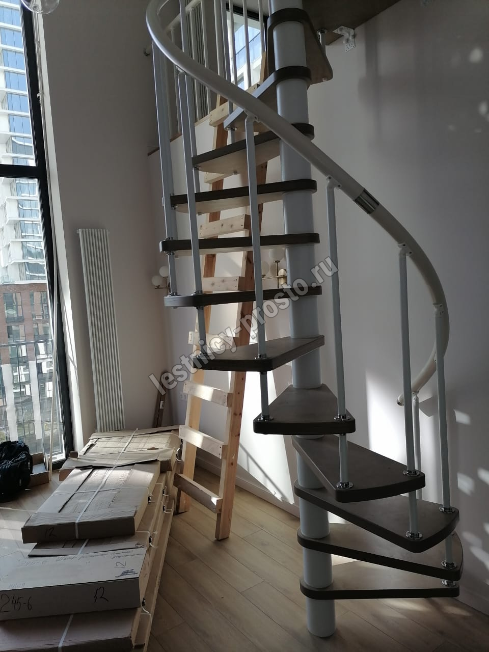 Лаконичная малогабаритная стильная винтовая модульная лестница с белым каркасом.
