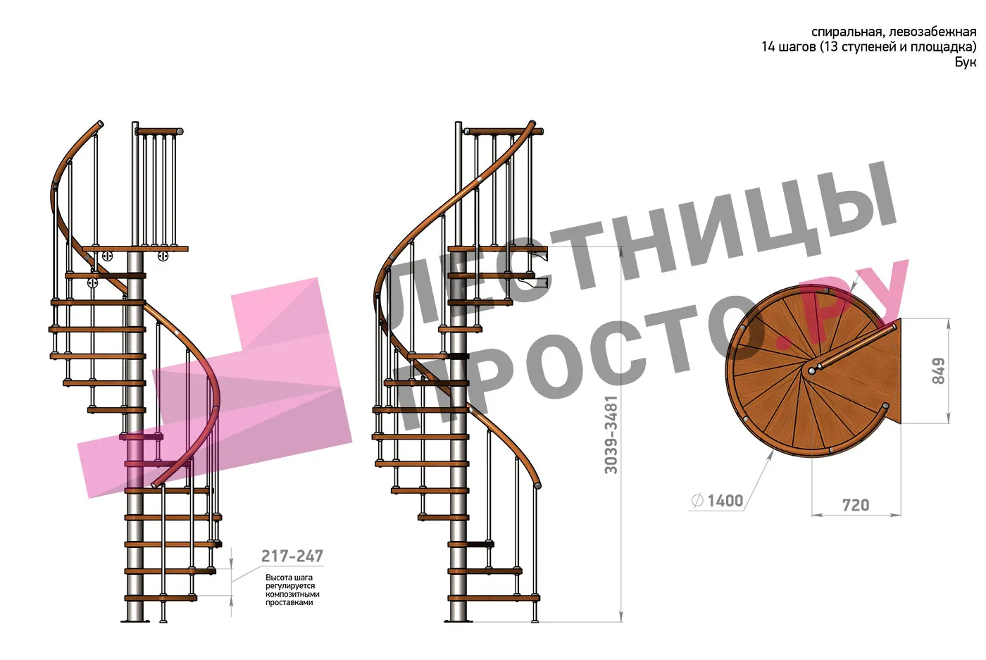 Левая, d=140см, 13 ступеней + площадка
