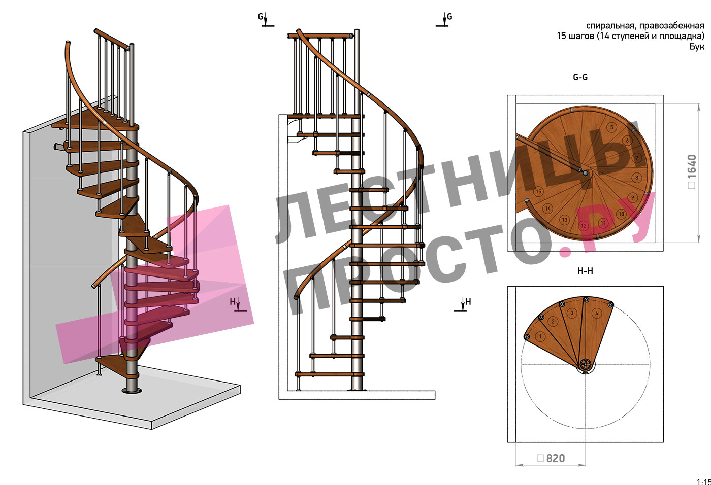 Правая, d=160см, 14 ступеней + площадка